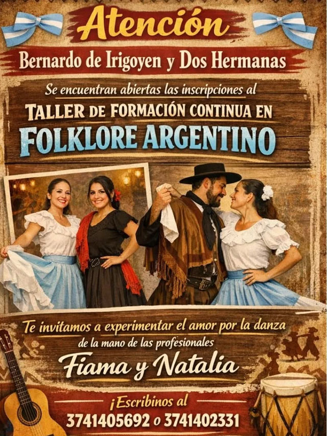 AGENCIA MISIONES.UNO | En Bernardo de Irigoyen y Dos Hermanas se encuentran abiertas las inscripciones para el Taller de Formación Continua en Folklore Argentino. La propuesta ofrece certificación, clases personalizadas y acompañamiento constante, y se dictará en la Terminal de Ómnibus, Local 37, los martes y jueves de 18:00 a 19:30 horas.