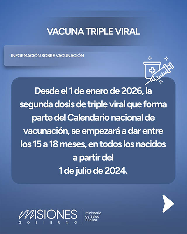 AGENCIAMISIONES.UNO | En Misiones informaron que, desde el 1 de enero de 2026, se modifica la edad de aplicación de la segunda dosis de la vacuna triple viral, de acuerdo con el Calendario Nacional de Vacunación.