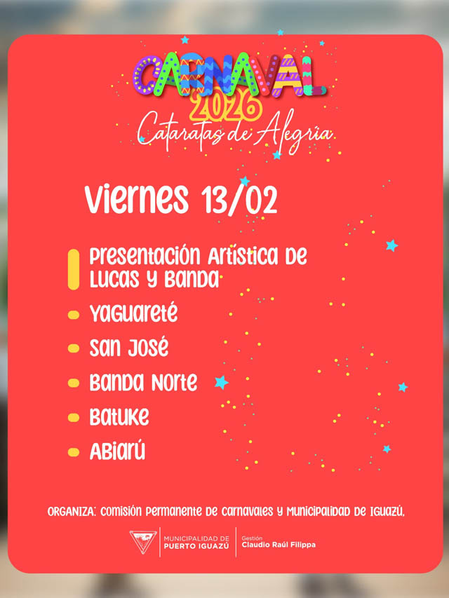 AGENCIA MISIONES.UNO | La ciudad de Puerto Iguazú se alista para celebrar una nueva edición del Carnaval “Cataratas de Alegría”, que se desarrollará los días 13, 14 y 15 de febrero, a partir de las 19 horas, en la costanera Eduardo Arrabal.